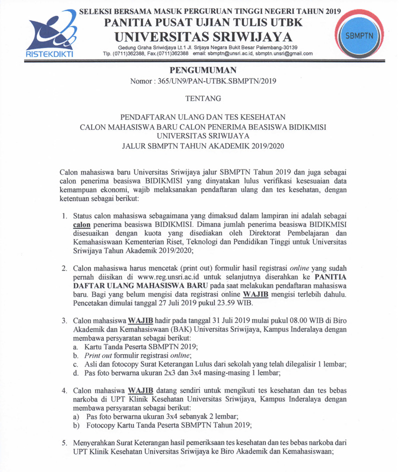 Pengumuman Hasil Seleksi Snmptn Unsri 2019 Universitas Sriwijaya