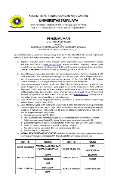 Pengumuman Registrasi Pdf Universitas Sriwijaya